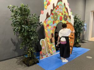 1回目の9/21(日)では「大道具作りを手伝おう」と題して、全5回を通して講師を務めて頂く舞台美術のスペシャリスト”カッパさん”のご指導のもと舞台上で使う『お菓子のいえ』に色を付けて、家の壁におかしを貼り付けました。