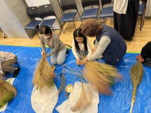 ほうき作りを始める前に、ほうき作りの歴史や伝統、どんな材料で作っているかなどのお話しを聞きました。