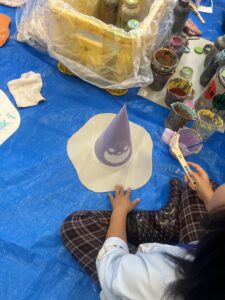 紙から帽子を切り出して貼り付けたあと、好き好きに色を塗り「魔女の帽子」を作りました。