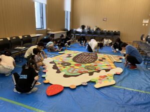 1回目の9/21(日)では「大道具作りを手伝おう」と題して、全5回を通して講師を務めて頂く舞台美術のスペシャリスト”カッパさん”のご指導のもと舞台上で使う『お菓子のいえ』に色を付けて、家の壁におかしを貼り付けました。