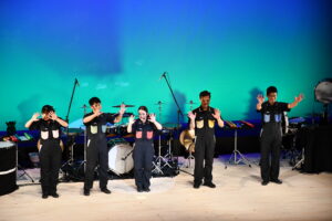 後半は運動会でよく耳にする曲を演奏しながら、組体操などのパフォーマンスをする演奏、様々なフォーメーションや体勢で行われるアクロバティックな演奏、打楽器のリズムと照明演出の合わさった演奏など、PPPの世界に引き込まれる楽しいパフォーマンスがたくさん行われました。観客参加コーナーでは、コールアンドレスポンスや観客全員でダンスを踊り、会場に一体感が生まれました。
