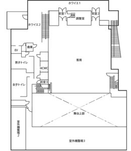 楽屋1 楽屋2 | 約22㎡ 約25㎡ | 12人程度 14人程度 |